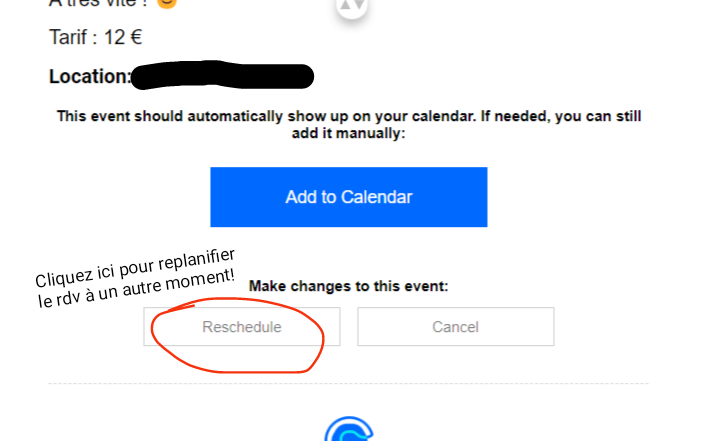 2/ Faites défiler le mail jusqu'en bas. Vous verrez écrit "Reschedule" vers la gauche (cf. Image ci-dessous). Cliquez dessus !